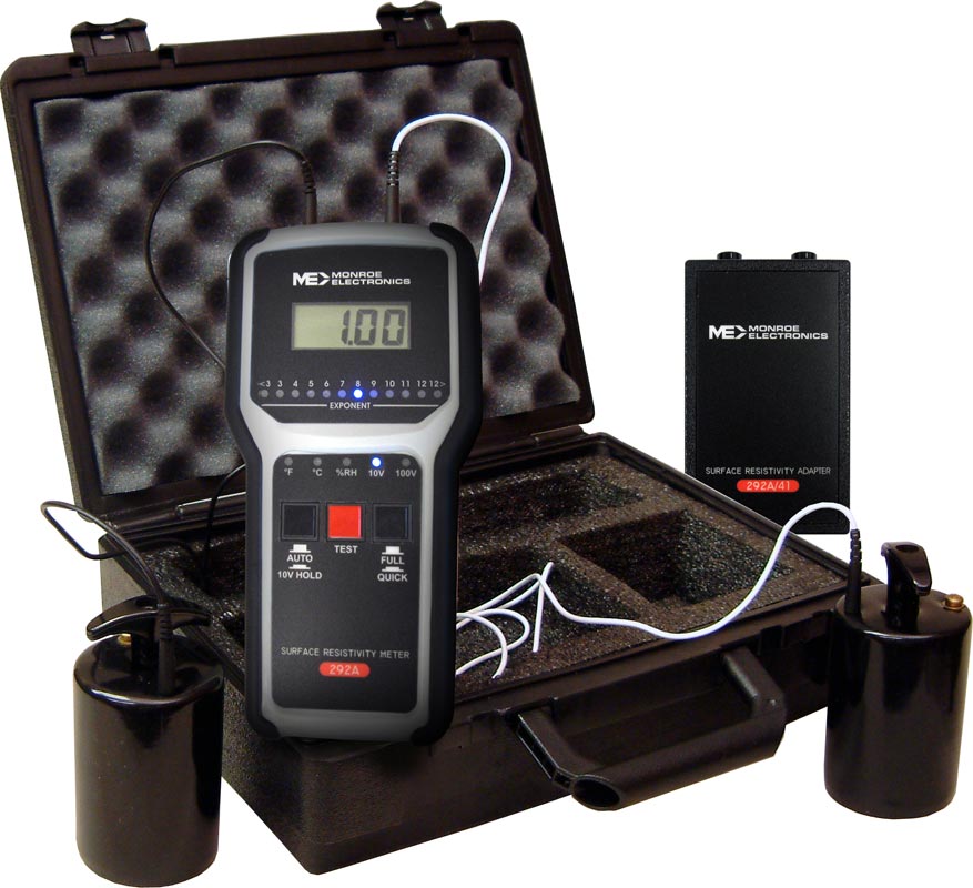 | Monroe Model 292A Digital Surface Resistance Test Kit is a portable, versatile, instrument designed to accurately measure resistance between two points (Rtt), surface to ground (Rtg), and surface resistivity in accordance with ANSI/ESD Association standard S-4.1. In addition, the meter measures ambient temperature and relative humidity. The Surface Resistance Meter (included in the kit) is designed to make measurements in accor-dance with specified test methods on: |