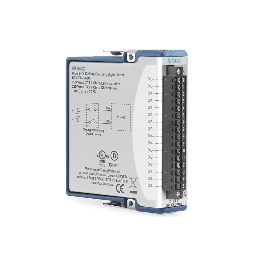 The C Series Digital Module interacts with a range of industrial switches, transducers, and devices. Some modules include an LED per channel that indicates the state of the channel. It supports input, output, or a combination of digital lines, and they can interact with a variety of voltages and logic levels, so they are well-suited for a variety of benchtop and industrial environments. Additionally, the C Series Digital Module also offers isolation options and sinking or sourcing capabilities to add further protection to your digital I/O application. When you use the C Series Digital Module with CompactRIO, you can use LabVIEW FPGA to create custom high-speed counter/timers, digital communication protocols, pulse generation, and more.The C Series Digital Module includes the NI-DAQmx driver and configuration utility that simplify configuration and measurements. NI-DAQmx supports NI programming environments as well as Python, ANSI C, C#.NET, and MathWorks MATLAB® software.