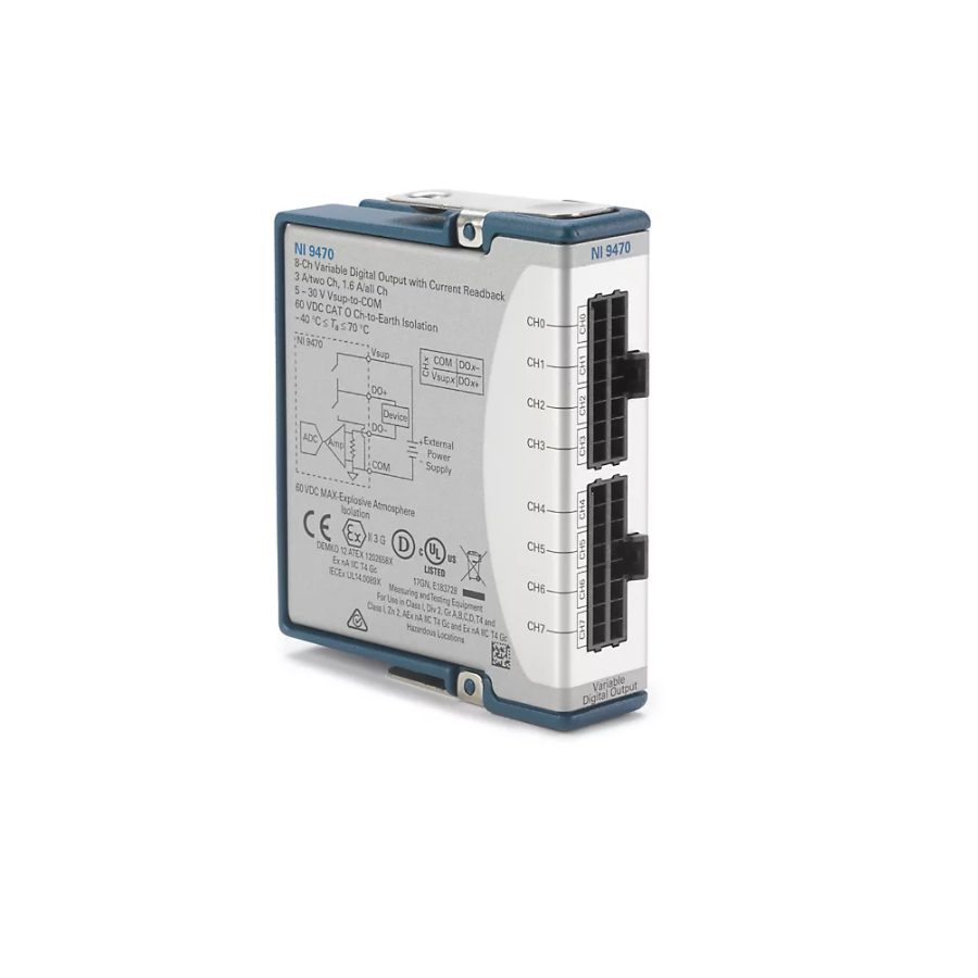 The C Series Digital Module interacts with a range of industrial switches, transducers, and devices. Some modules include an LED per channel that indicates the state of the channel. It supports input, output, or a combination of digital lines, and they can interact with a variety of voltages and logic levels, so they are well-suited for a variety of benchtop and industrial environments. Additionally, the C Series Digital Module also offers isolation options and sinking or sourcing capabilities to add further protection to your digital I/O application. When you use the C Series Digital Module with CompactRIO, you can use LabVIEW FPGA to create custom high-speed counter/timers, digital communication protocols, pulse generation, and more.The C Series Digital Module includes the NI-DAQmx driver and configuration utility that simplify configuration and measurements. NI-DAQmx supports NI programming environments as well as Python, ANSI C, C#.NET, and MathWorks MATLAB® software.