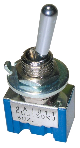 Nidec Components 8A3011-Z High-Reliability Miniature Toggle Switch 3PDT, ON-ON, 10.5mm toggle, 1/4"-40 threaded bushing, solder lug terminals, 6A @ 125V AC