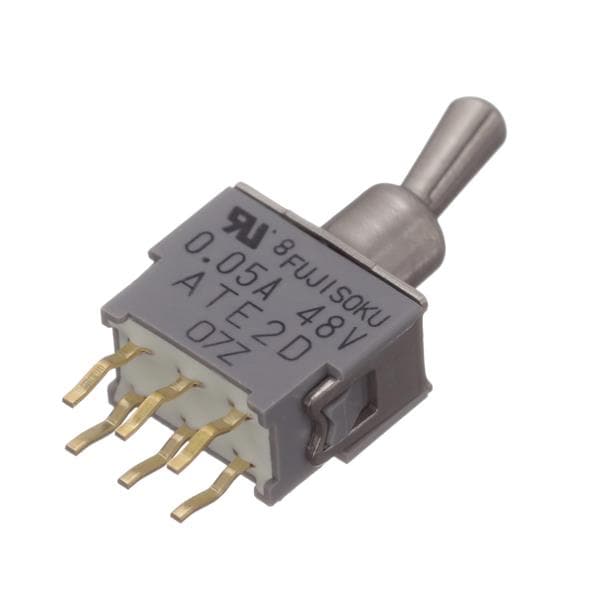 Nidec Components ATE2D-2M3-10-Z Subminiature Toggle Switch DPDT, ON-ON, 6mm toggle, 4mm smooth bushing, straight PC terminals, .1" between terminal rows, 50mA @ 60V AC/DC, washable