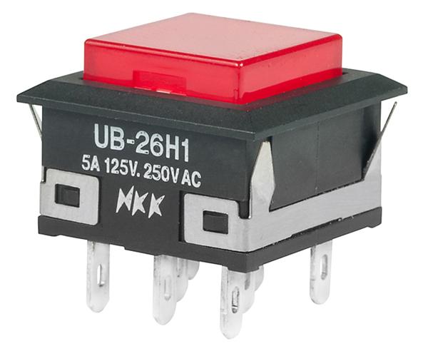 NKK Switches UB26NBKW015C-CC/CUL Pushbutton Switches Low Profile Pushbutton DPDT, ON-ON, 5A 125VAC 30VDC, Rectangular Red Actuator, Red LED 1.85VDC, Snap-In Mount, Solder, 22.40mm x 16.20 mm Rectangular Panel Cutout, UL Rated