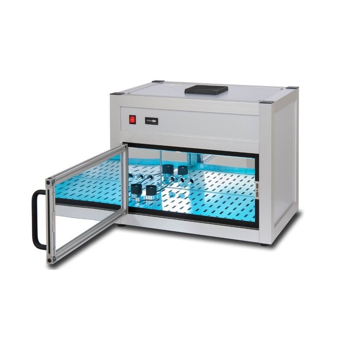 The interior irradiation chamber has a base area of 46 x 32 cm and a height of 20 cm. The sample chamber operating temperature is about 25°C to 70 °C so that thermal damage to the specimen can be avoided or accelerated.