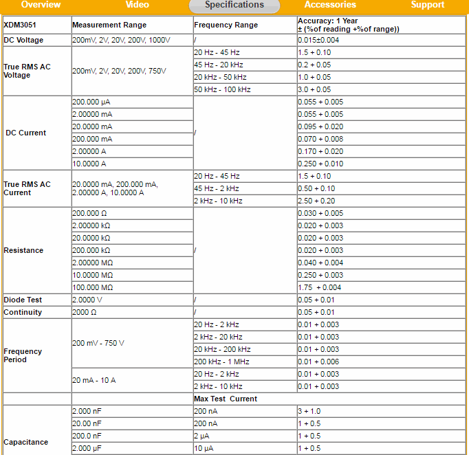 DC Current 200μA/2 mA/20mA/200mA/2A/10A/ 0.055% + 0.005 ~ 0.250% + 0.010