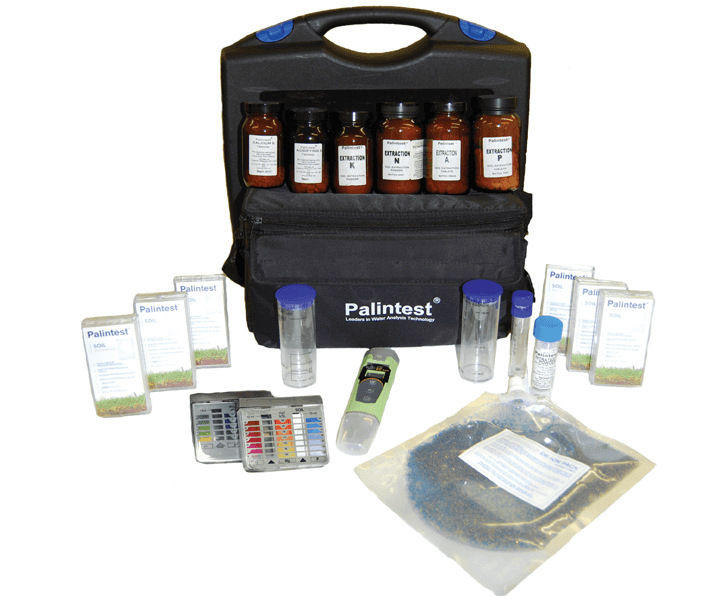 Visual test equipment and reagents for soil pH, lime requirement, nitrogen (N), phosphorus (P) and potassium (K) macronutrients plus magnesium and calcium testing.