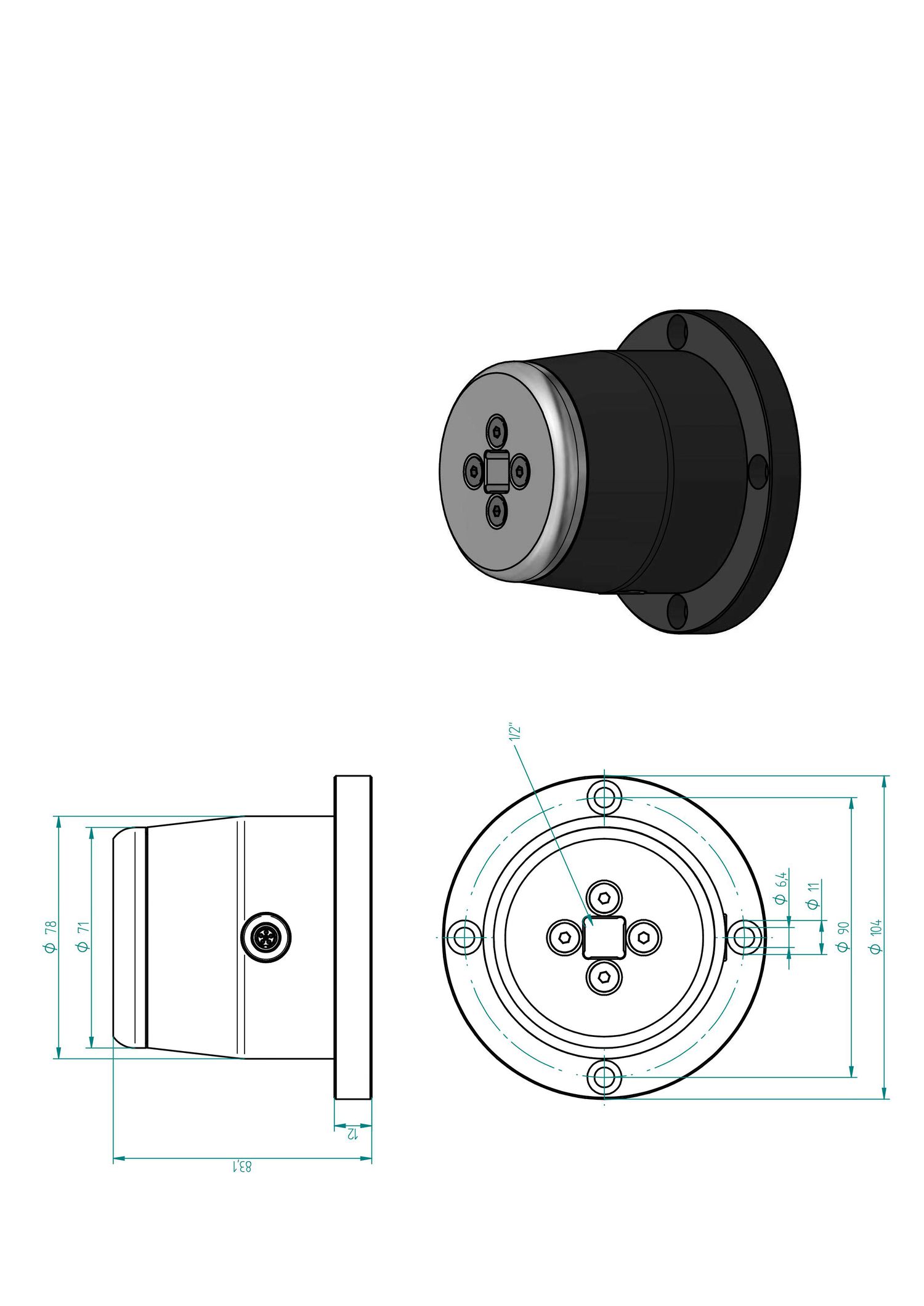 Torque transducer dimensions: H 85 mm/Ø 72 mm/Ø 104 mm (H 3.3"/Ø 2.8"/Ø 4.1")(see technical drawing)