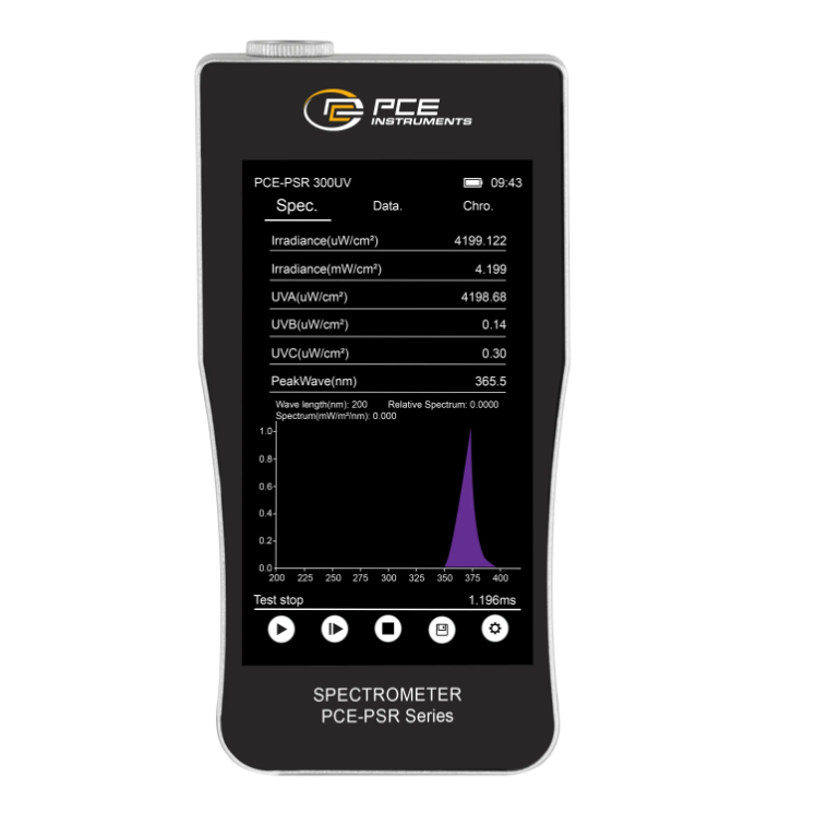 Light parameters: Irradiance (µW/cm²), Irradiance (mW/cm²), UV hazard Ee (µW/cm²), UVA (µW/cm²), UVB (µW/cm²), UVC (µW/cm²), PeakWave (nm), HalfWidth (nm), Darksignal, Peak signal, IntegTime (ms), Transmittance (%)