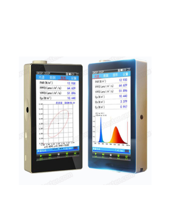 OHSP350P Plant light analyzer is a protable equipment to test PAR (Photosynthetically active radiation), PPFD (Photosynthetic photon flux density), YPFD (Effective photosynthetic photon flux density), Eb (Blue-violet irradiance), Ey (Yellow-green irradiance), Er (Red-orange irradiance), Rrb ratio (Red and blue irradiance ratio), CT (color temperature), lx (illuminance), CRI (color rendering index), chromaticity coordinates and etc. for Plant growth lamp. The plant light analyzer is widely applied to on-site monitoring of light radiation of plant growth lamp manufacturers, plant soilless cultivation and greenhouses.