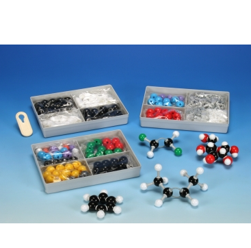 The kit contains all needed elements and connections for ball-and-stick models of organic and inorganic standard molecules.