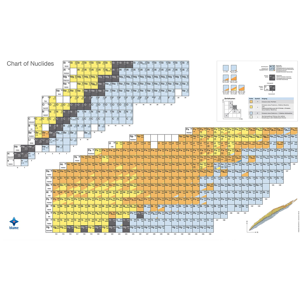 The blume chart of nuclides shows didactically optimized over 3,000 currently experimentally proven nuclides. The map provides over 10,000 highly precise data based on the well-respected National Nuclear Data Center of the Brookhaven Institute (USA). For teaching, studying and research in various departments, the great didactic value is in particular the readability optimized presentation of the data in interaction with the format adapted to the respective field of application.