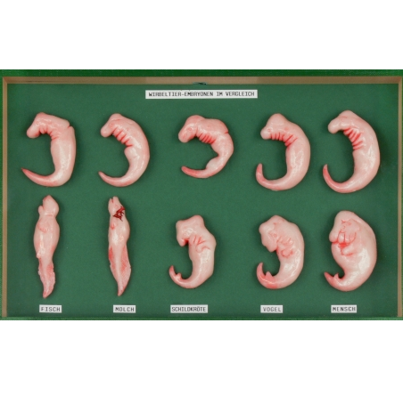 Reproductions in a box under glass, 40 x 25 cm. Early stages of fish, amphibian, reptile, bird, human. The upper row shows the remarkable morphological similarity of the vertebrate embryos in their early stages of development. In the lower row - especially in fish and amphibian - striking differentiations are already indicated. Embryos were selected which correspond to each other in their developmental stage, but do not have to be of the same age