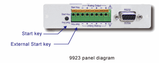 The 9923 supports stand-alone operation as well. In this case, the user needs only to download the waveform data to the 9923 EEPROM. If there is no need for the application software to record the voltage, current and other information, the computer connection can be removed. The user only has to press the Start button on the 9923 rear-panel itself. The analog output will begin to load according to the edited voltage level and feed the analog input of the timing output voltage signal to the electronic load. Users can also use the Start key terminal connection (External Start key) to connect an appropriate length remote external button if more convenient.