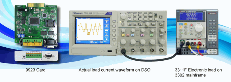 The second method is to use the new 9923 load current generator which can be installed on a wide range of Prodigit’s DC electronic loads. The generator output is connected to the DC load’s analog input using the provided BNC cable and eliminates the need for a separate arbitrary generator. Use either manual waveform data editing or import and oscilloscope waveform to generate simulated load current waveform on the DC load.