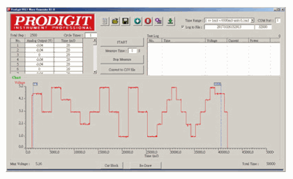 3. After starting the test, if you set the Measure Time to a value greater than 0, the program measures the voltage, current, power and other information, and records in the Test Log according to the time interval set.