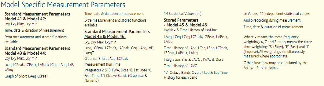 | Model 42 | Class 2 | SPL | A C Z (simultaneous measurement) frequency weighting |