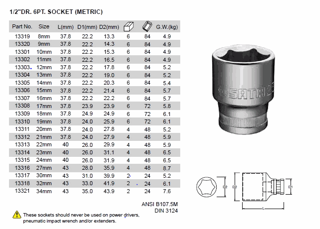 SATA 13313 DR. 6PT. SOCKET (METRIC) (22mm,1/2inch)