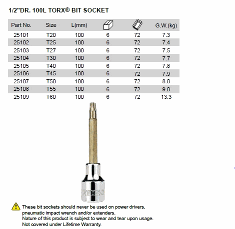SATA 25108 DR. 100L TORX BIT SOCKET (T-55 1/2inch)