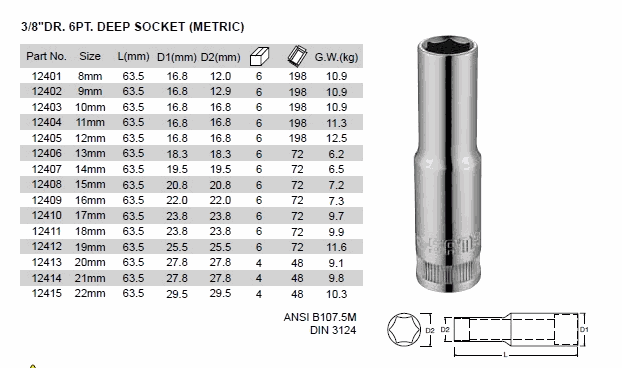 SATA 12406 3/8inch DR. 6PT. DEEP SOCKET (3/8inch,13mm,SAE,METRIC)