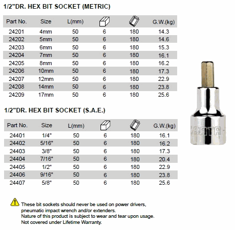 SATA 24204 1/2inch DR. HEX BIT SOCKET (S.A.E /METRIC) | EMIN.COM.MM
