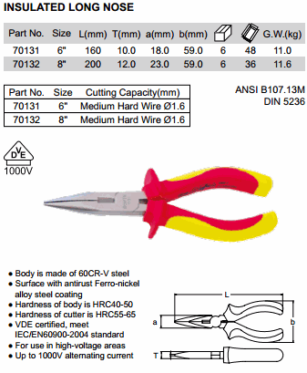 SATA 70131 Insulated Long Nose Piler (6 inch, ø1.6mm, 1000V) | EMIN.COM.MM