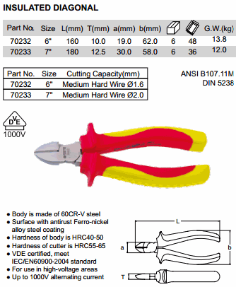 SATA 70232 INSULATED DIAGONAL PLIER (6 inch, ø1.6mm, 1000V) | EMIN.COM.MM