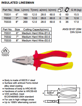 SATA 70331 INSULATED LINESMAN PLIER 6 INCH (160mm, ø1.6mm, 1000V) | EMIN.COM.MM