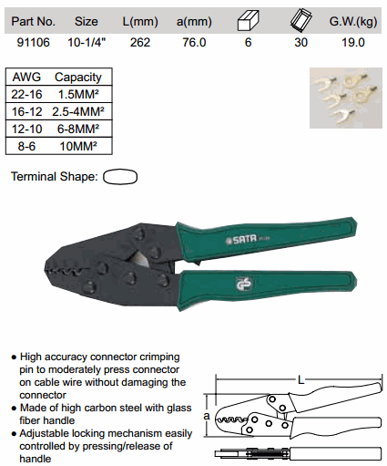 SATA 91106 HEAVY DUTY NON - INSULATED CRIMPING TOOL (10-1/4 inch, 1.5MM²-10MM²)