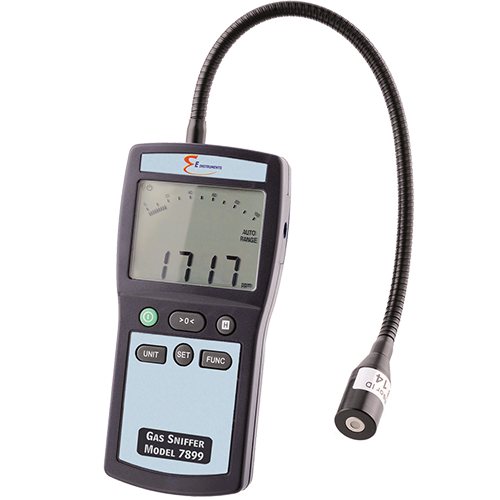 The New Model 7899 Portable Gas Leak Detector is a rugged, highly–sensitive, accurate and easy–to–use leak tester with an LED display, scale and audible beeper to effectively pinpoint small leaks of Combustible gas hydrocarbon fuels from any piping and/or appliances. Inaccessible points can be reached with the flexible, 11" long probe.