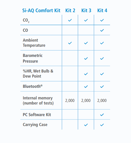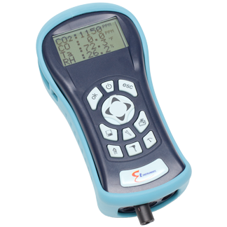 Portable indoor air quality monitoring device type Si-AQ Comfort 03 measuring: CO2 (0-5000ppm) / ambient temperature / relative humidity / wet temperature / dew point temperature / atmospheric pressure. Bluetooth wireless communication for optional printer. Memory of 2000 points. Supplied with calibration certificate and carrying case.