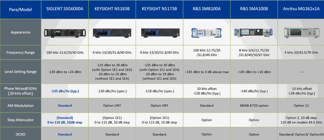 Standard: AM Modulation, step attenuator (0 to 110dB), OCXO
