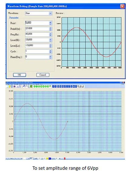 - Since the amplitude representation of the PC software is directly calculated in 16bit points, the range +32,767 ~ -32,767 corresponds to 10Vpp (+5V ~ -5V), then: