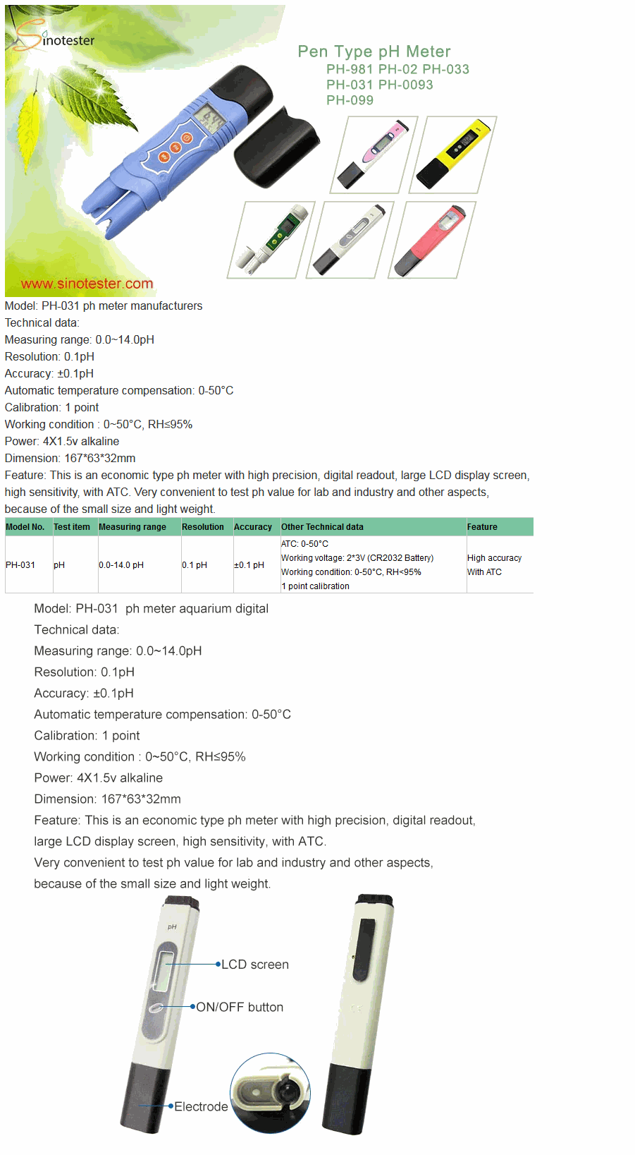 Sinotester PH-031 Pen Type pH Meter (0.0~14.0pH, ±0.1pH) | EMIN.COM.MM
