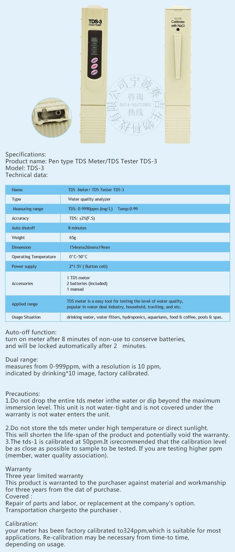 - Measuring range: 0~9990ppm TDS,0~99℃ Temp