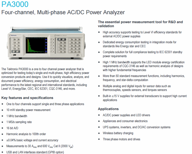 TEKTRONIX PA3000 3CH Multi-phase AC/DC Power Analyzer (600Vrms, 30Arms)