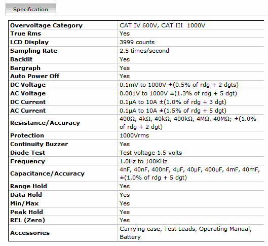 - Accessories: Carrying case, Test Leads, Operating Manual, Battery