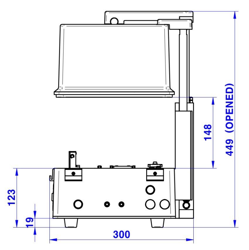 - Outside: 459(W) x 300(D) x 300(H) mm, lid closed. 449(H) mm, lid open.