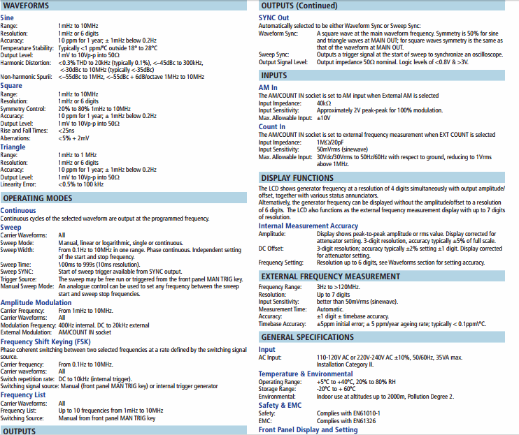 Frequency List: Up to 10 frequencies from 1mHz to 10MHz