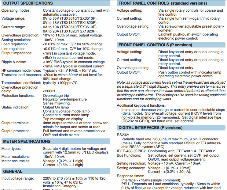 TTI TSX1820P Bench DC Power Supply (0〜18V、0〜20A、360W、RS232 / GPIB)
