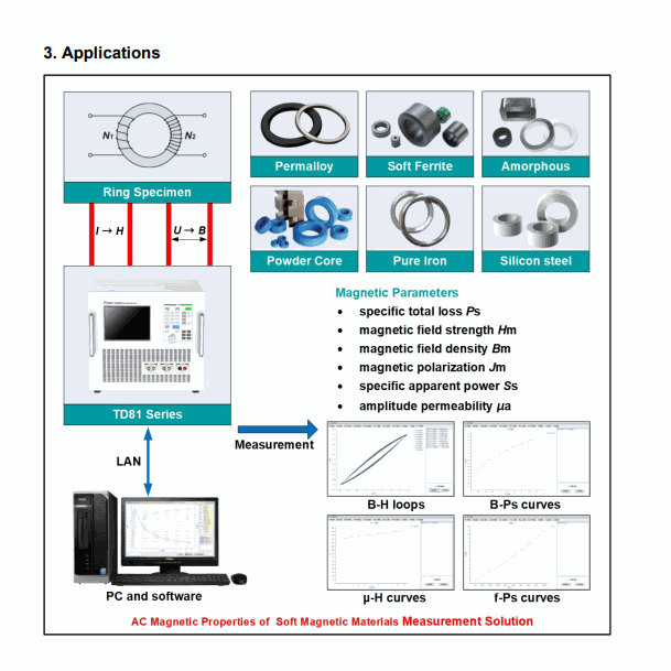 TD81 Series is AC Magnetic Properties Measuring System for Soft Magnetic Materials. The product design conforms to the standard IEC 60404-6, GB/T 3658-2008. These series instruments cover frequency range from 20 Hz up to 1 MHz, depending on the selected model. It used for testing the AC magnetic properties and curves of ring core specimen.