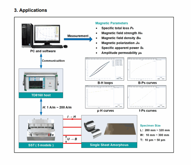 TD8160 consists of excitation and measurement host, single sheet tester and computer software, etc.The product design conforms to the standard IEC 60404-16-2018, GB/T 19346.3-2021. Testingfrequency from 45 Hz to 65 Hz (400 Hz is customizable). It used for testing the ACmagneticproperties amorphous or Nano crystalline single sheet.