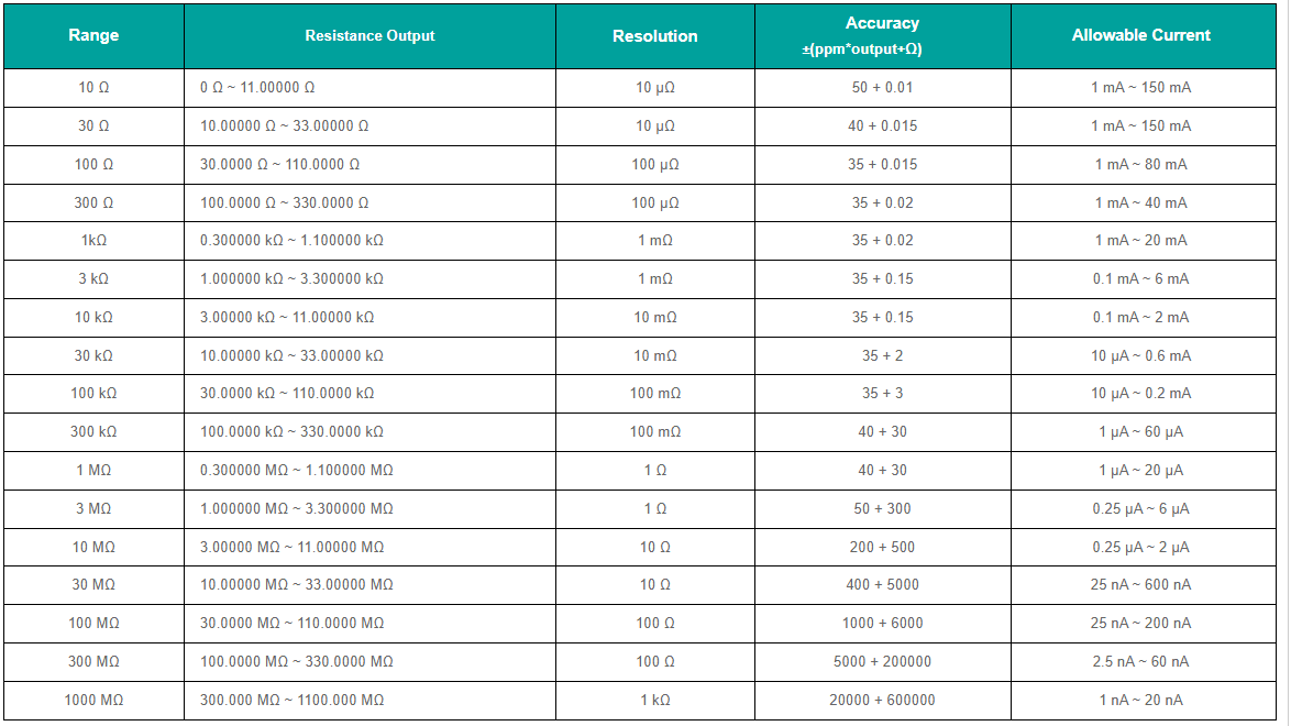Resistance Output: 0 Ω ~ 1100 MΩ