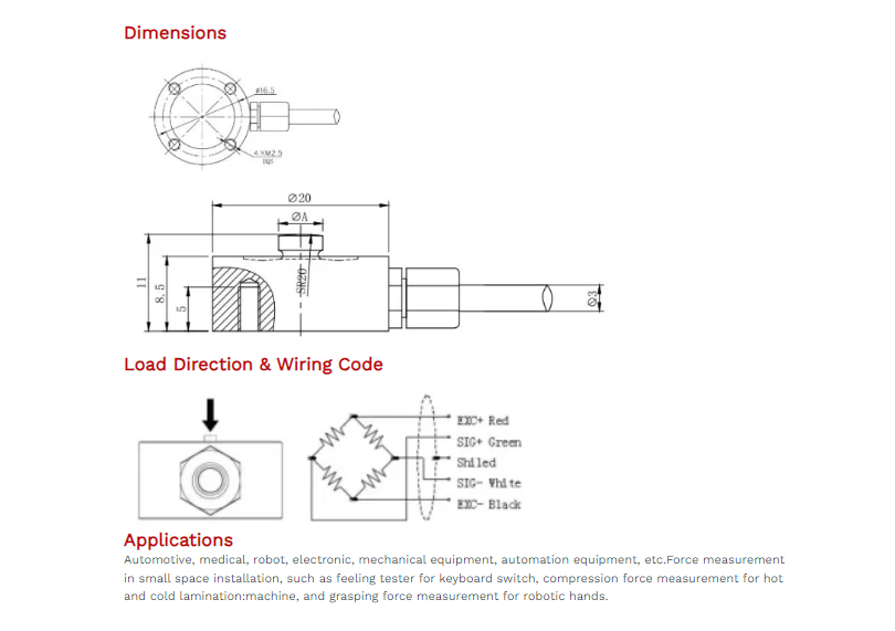 Cable Connection: Ex+: Red; Ex-: Black; Sig+: Green; Sig-: White