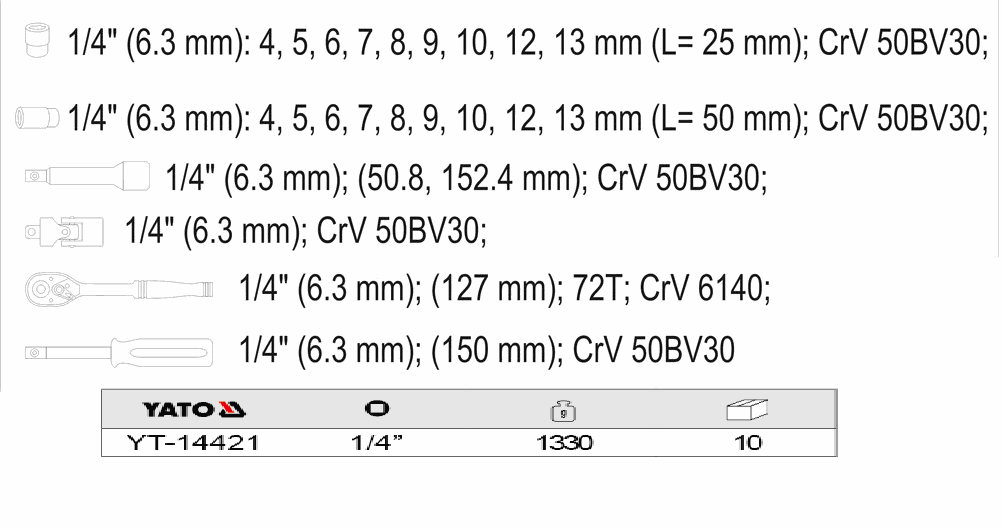 Hex sockets 1/4": short 4, 5, 6, 7, 8, 9, 10, 12, 13 mm; deep:4, 5, 6, 7, 8, 9, 10, 12, 13